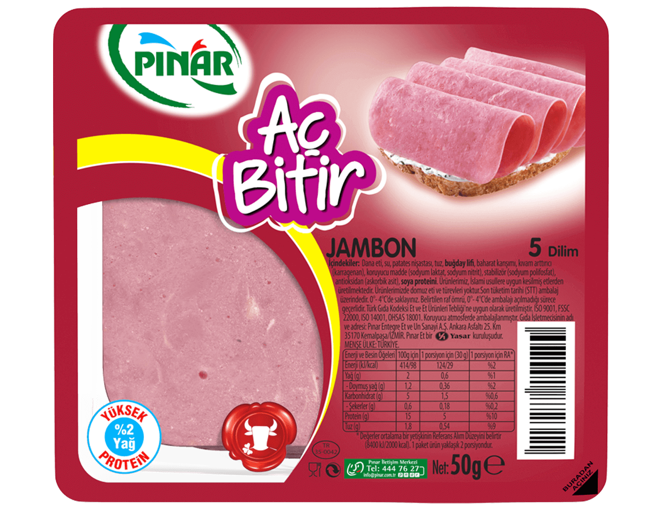 تأتي عائلة شرائح لحم البقر للوجبات الخفيفة من بينار بنوعين: 50 جراماً من لحم البقر و60 جراماً من لحم الديك الرومي.