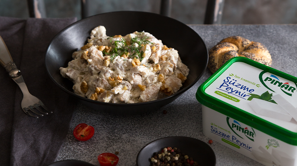 საფეხური 1 :ქათმის ხორცი დაჭერით კუბიკებად და შეწვით ცოტაოდენ წყალთან და ზეითუნის ზეთთან ერთად. დაუმატეთ დაჭრილი ხახვი და ნიორი და განაგრძეთ შეწვა. დაუმატეთ წვრილად დაჭრილი სოკო, დაქუცმაცებული ნიგოზი, მარილი და ახლად დაფქული შავი პილპილი, მოშუშეთ დაბალ ცეცხლზე. ბოლოს დაუმატეთ პინარის ნაღები და ჩანგლით დაქუცმაცებული პინარის პრემიუმ ფეტა ყველი და კარგად აურიეთ. შეწვით კიდევ 1-2 წუთი და მიირთვით. სურვილისამებრ შეგიძლიათ მორთოთ კამათი.